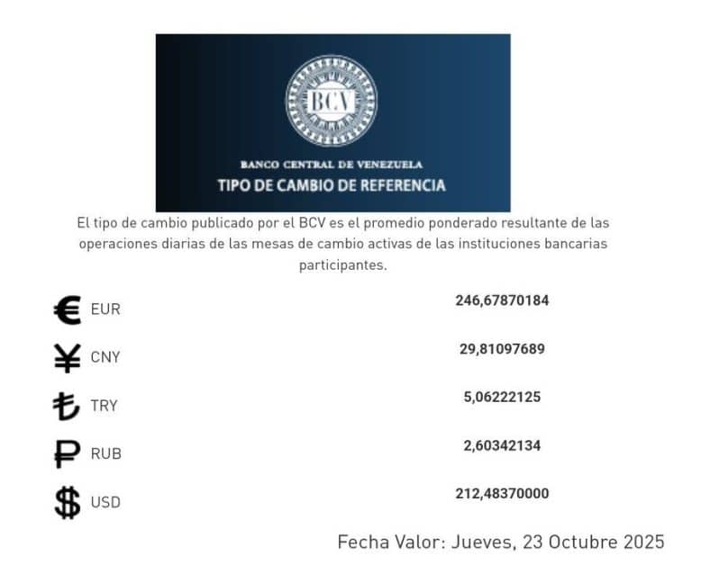 De acuerdo a la información suministrada por el Banco Central de Venezuela (BCV) este miércoles 22 de octubre el tipo de cambio oficial cerró en 212,48. El ente emisor recordó que el tipo de cambio publicado por el BCV es el promedio ponderado de las operaciones de las mesas de cambio de las […]