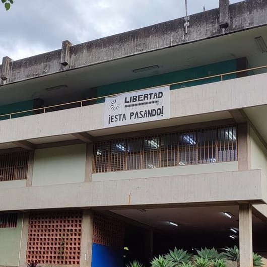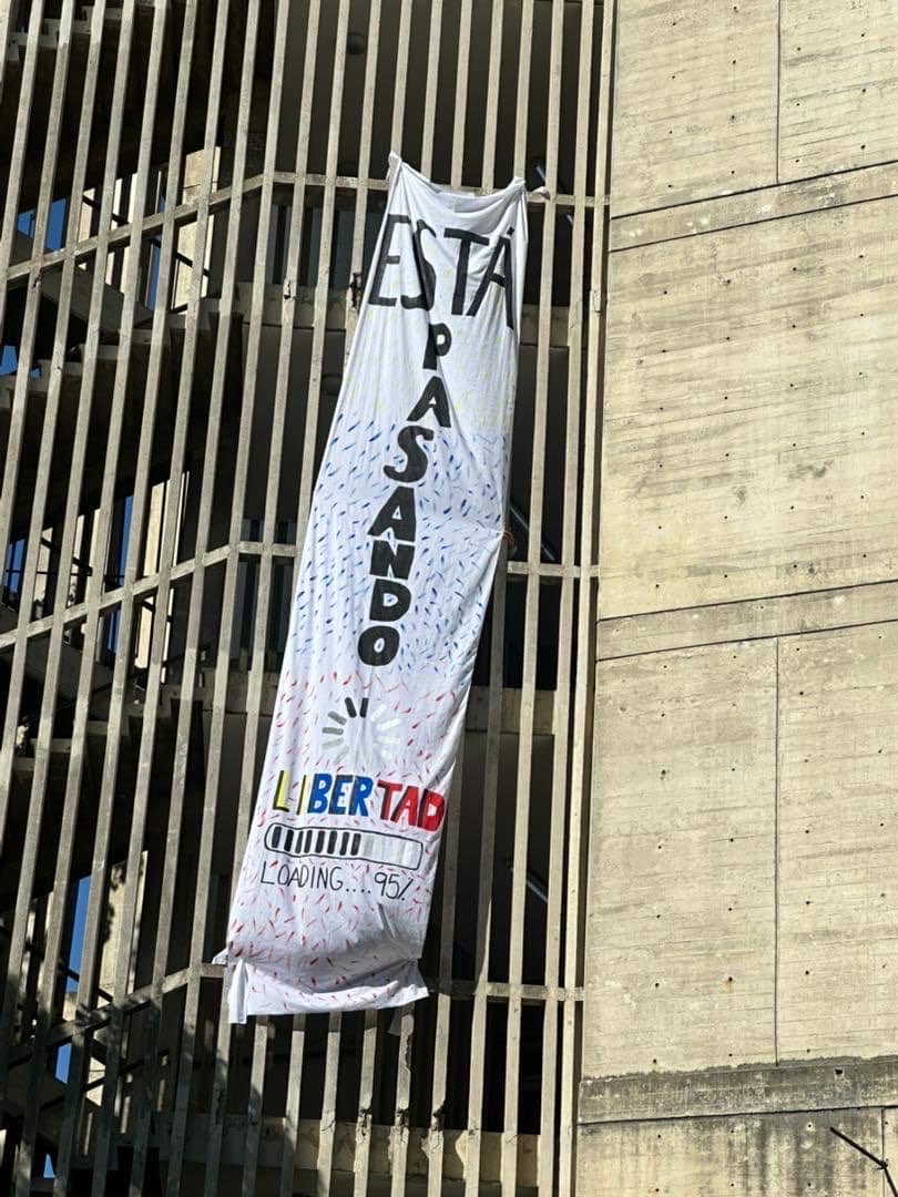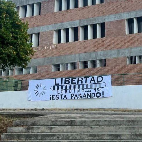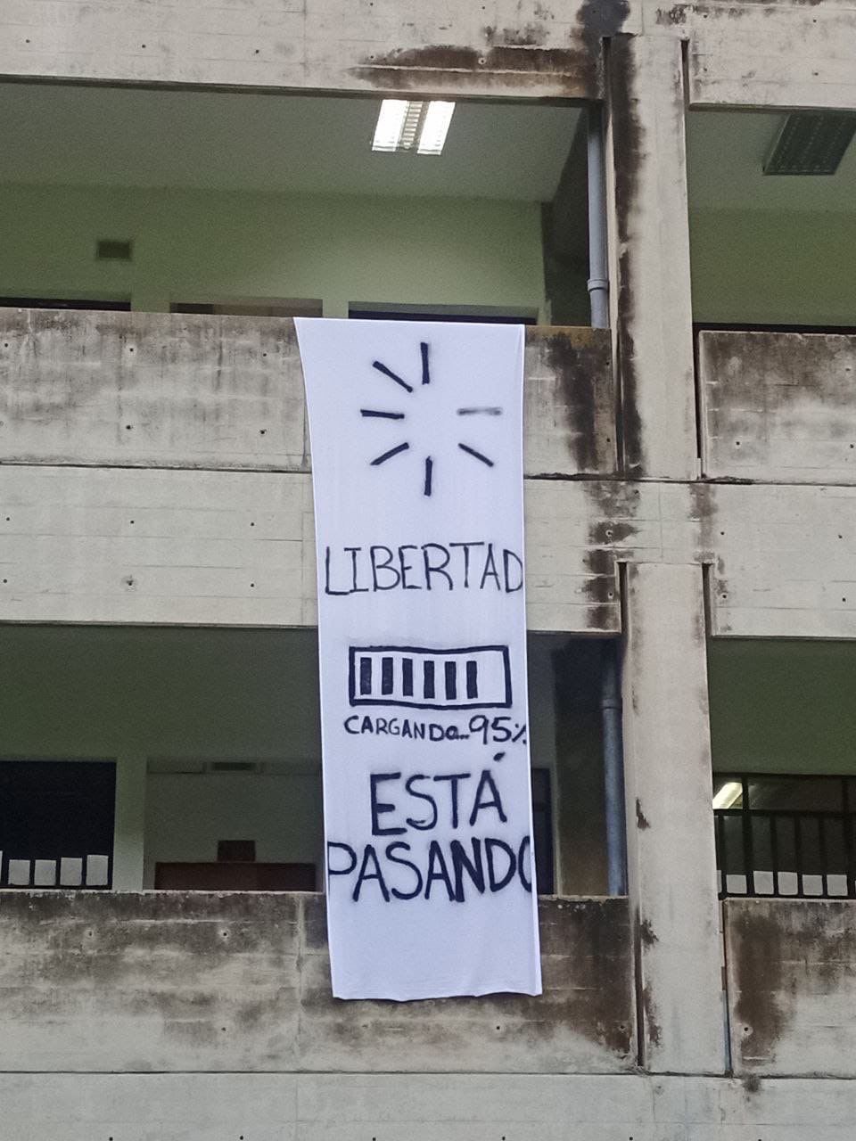 «Libertad cargando… 95%» se puede leer en los grandes lienzos colgados en las infraestructuras educativas.