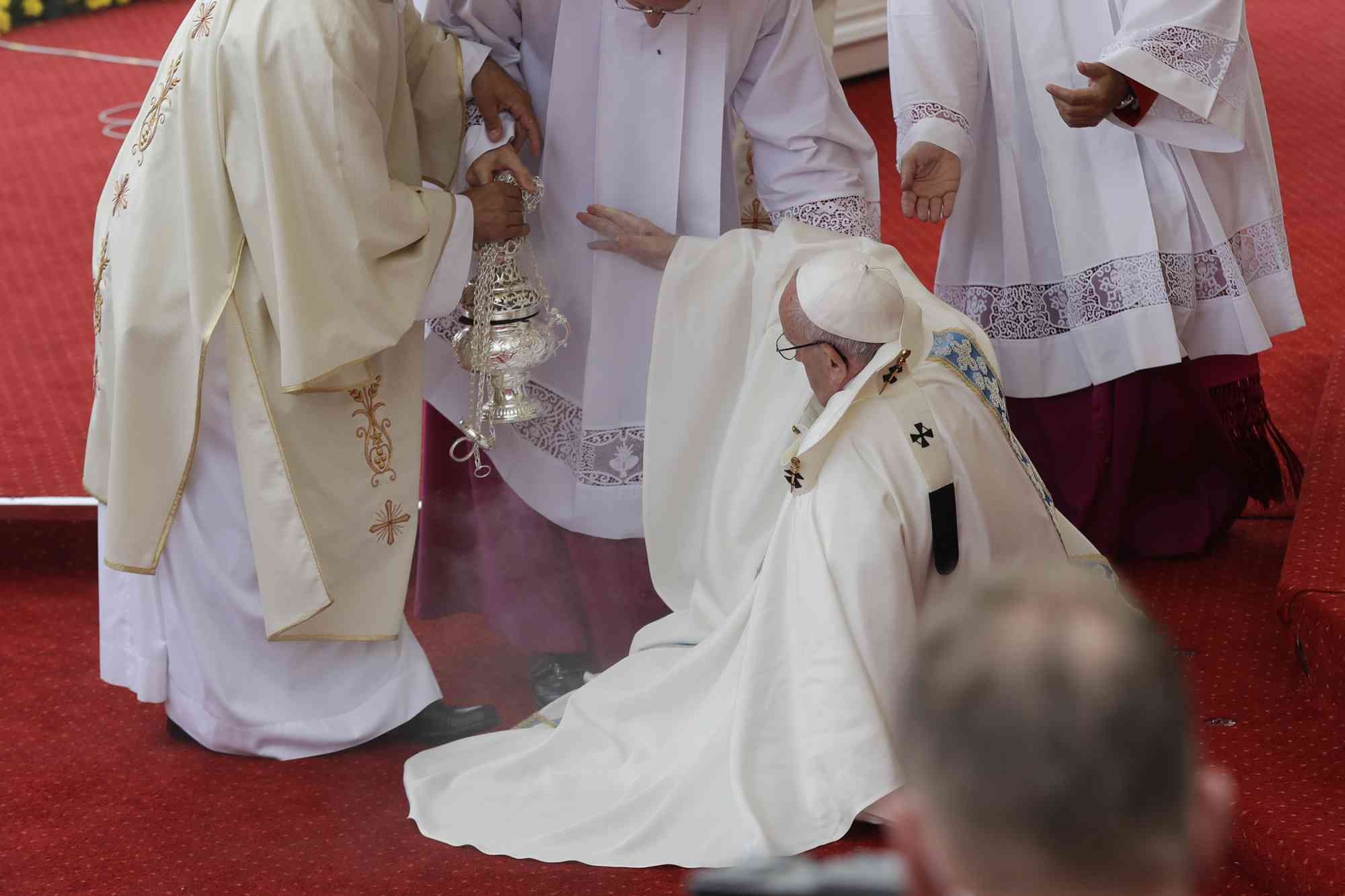 Francisco cayó de un escalón mientras se dirigía al altar y tuvo que ser levantado por un grupo de religiosos que lo asistían, tras lo cual prosiguió la celebración sin problemas. Llegó a bordo del papamóvil a la explanada del popular santuario de Jasna Gora, el lugar donde desde el siglo XIV se venera el icono de la “Virgen Negra”, llamada así por el color de su piel y donde una muchedumbre silenciosa lo esperaba.