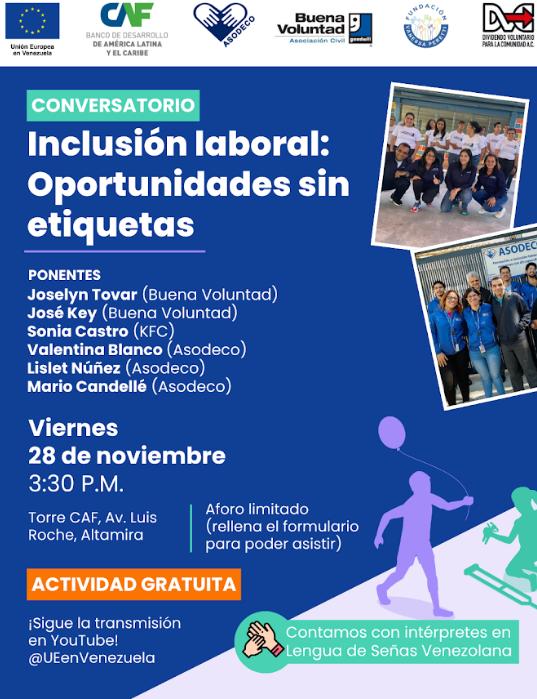 Con este ciclo, la Unión Europea busca sensibilizar a la sociedad venezolana sobre los derechos y capacidades de las personas con discapacidad, así como ofrecer herramientas prácticas para avanzar hacia una inclusión real en los ámbitos deportivo, digital, laboral y del cuidado. Para más información e inscripciones: