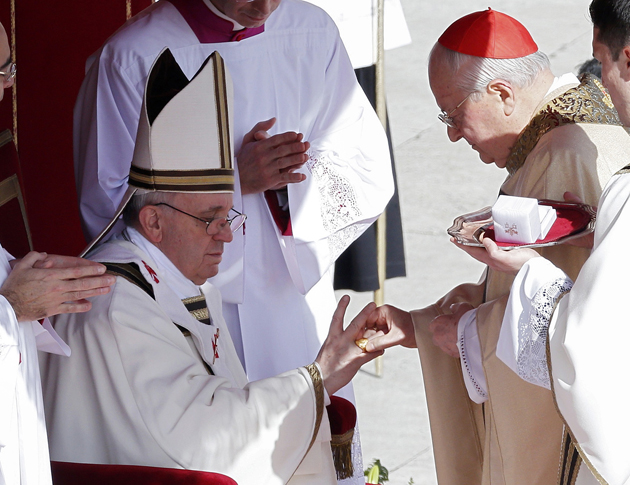 El cardenal protodiácono, Jean Louis Tauran, colocó al papa Francisco el Palio, antigua insignia episcopal, y el decano, Angelo Sodano, el anillo del Pescador, símbolos del pontificado, con lo que comienza el papado del argentino Jorge Mario Bergoglio, de 76 años. El palio es una estola confeccionada con lana de cordero que simboliza al […]