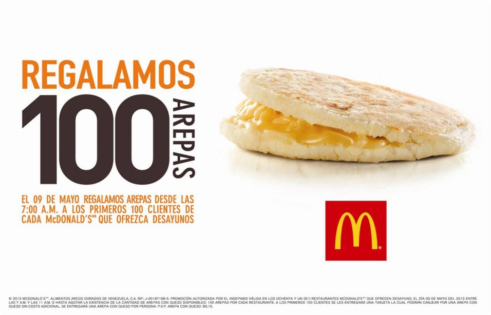 McDonald´s se suma a quienes promueven la importancia de adquirir y mantener el saludable hábito de un buen desayuno. La empresa refuerza su mensaje a través de una gran actividad, la cual consiste en regalar una arepa con queso a los primeros 100 clientes que lleguen a cualquier de los 81 restaurantes que ofrecen menú […]
