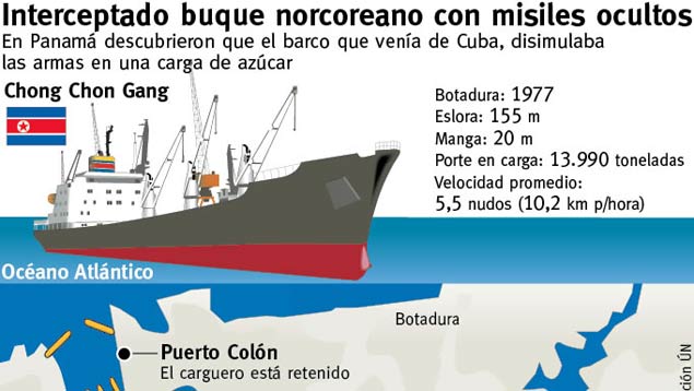 Un buque norcoreano, procedente de la isla caribeña, permanece anclado en el Canal de Panamá por ocultar un «supuesto equipo de misiles» entre 220 mil quintales de azúcar. Aquí, se muestra cuál fue la trayectoria del carguero»Chong Chon Gang» desde que zarpó de Cuba La carga estaba escondida entre 220 mil quintales de azúcar, […]