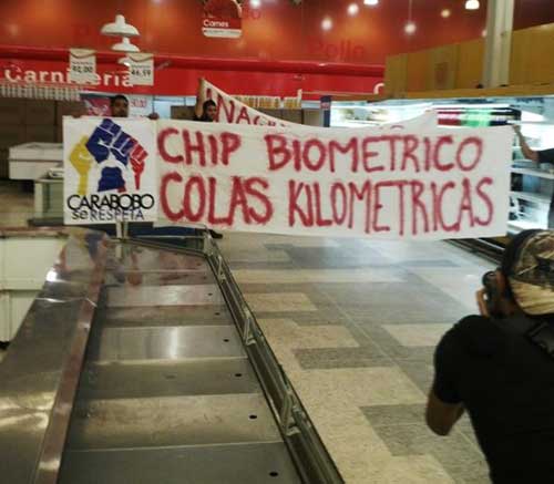 Miembros del movimiento “Carabobo se Respeta” protestaron este sábado en un supermercado de Valencia, en contra de la implementación del “sistema biométrico” que el Ejecutivo aplicará para la compra de productos básicos. Con pancartas con las inscripciones “Anaquel vacío en ‘robolución’” y “Chip biométrico, colas kilométricas”, el grupo se apostó frente a las neveras […]