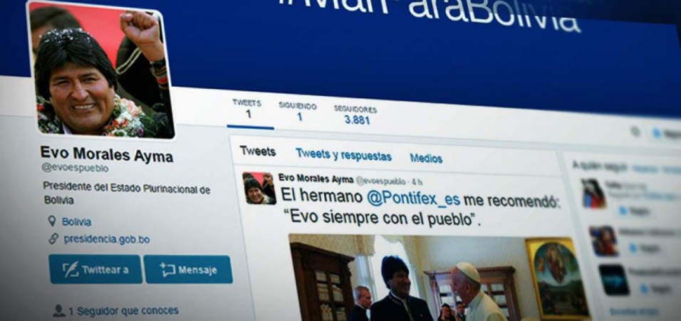 El presidente de Bolivia, Evo Morales, estrenó el viernes una cuenta oficial en la red social Twitter y la inauguró desde El Vaticano con una fotografía junto al papa Francisco en la que ambos aparecen riendo. Morales abrió su perfil bajo el nombre @evoespueblo y la autenticidad de la cuenta fue […]