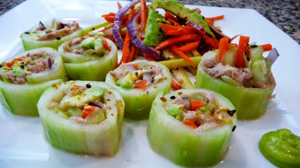 Ingredientes 1 lata de atún en agua (5oz) 1 Pepino grande una mitad de aguacate en rebanadas 1 Zanahoria en juliana 1 ramita de Apio en juliana 3 cdas Cebolla morada 1 cda Mayonesa 1 cdita Wasabi en […]