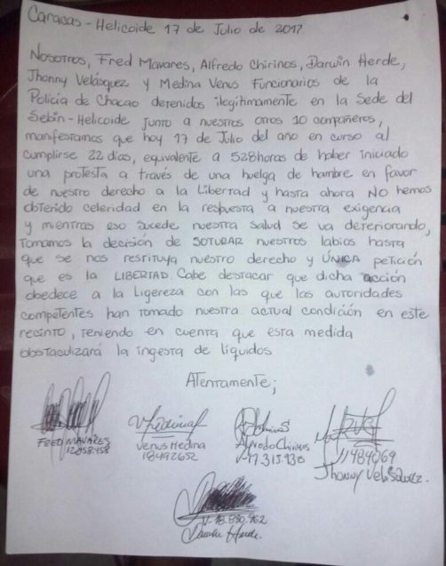 Cinco de los 14 funcionarios de la Policía de Chacao (Polichacao) se cosieron la boca este lunes. Esta medida extrema de protesta la realizan después de 22 días de huelga de hambre para exigir su liberación. Los 14 polichacao permanecen detenidos en la sede del Servicio Bolivariano de Inteligencia Nacional (Sebin) de El […]