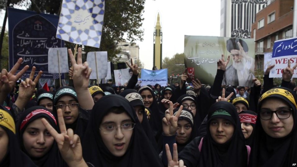 Niñas estudiantes iraníes hace el signo de la victoria en una manifestación anual frente a la excede de la embajada de EE.UU. en Teherán, en el aniversario de la toma de la sede diplomática el sábado, 4 de noviembre de 2017. Irán celebró el sábado la toma de la embajada de Estados Unidos […]
