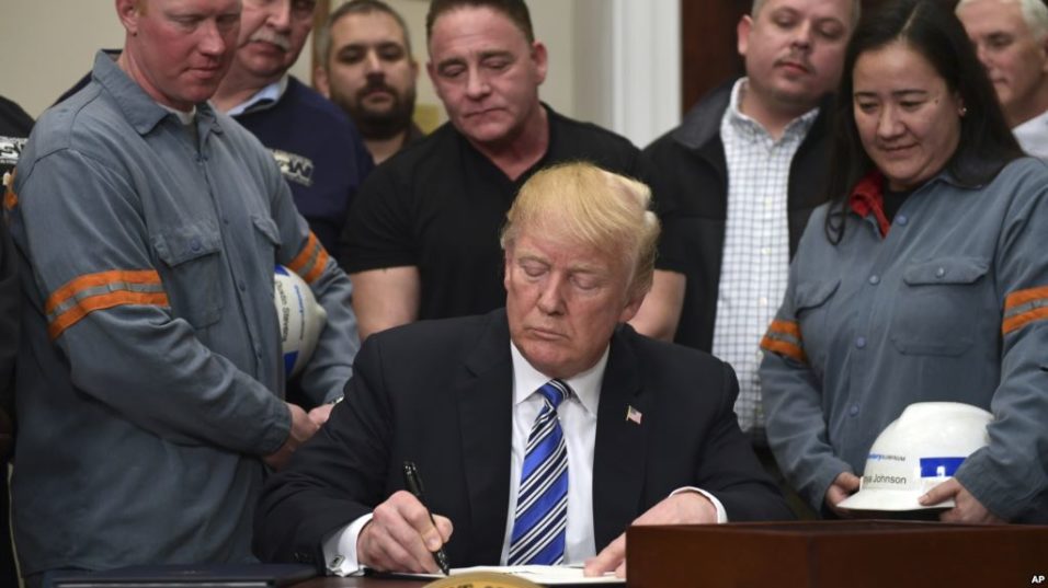 El presidente Trump firma la proclamación sobre las importaciones de acero durante una ceremonia en la que estuvo acompañado de trabajadores de esa industria. El presidente Donald Trump firmó el jueves las órdenes que imponen aranceles a las importaciones de acero y aluminio en respuesta a lo que él califica de «ataque a […]