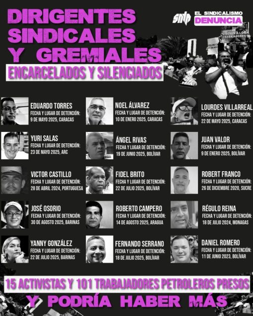 Muchos han sido desaparecidos temporalmente, se les han negado abogados privados, enfrentan juicios sin garantías y se desconocen los cargos que les imputan El Sindicato Nacional de Trabajadores de la Prensa (SNTP) alerta sobre el grave patrón de persecución, criminalización y encarcelamiento de dirigentes sindicales y gremiales en Venezuela, que se ha intensificado en los últimos […]