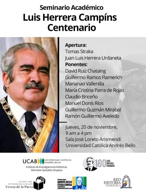El Instituto de Investigaciones Histórica Hermann González Oropeza S.J de la UCAB realizará el Seminario Académico Luis Herrera Campíns Centenario, el 20 de noviembre, con el apoyo de la Cátedra Libre Andrés Bello, la de Estudios de la Mujer Teresa de la Parra , la Red Historia Venezuela y la Comisión del Centenario En un […]
