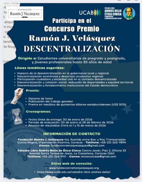 La Cátedra Libre Andrés Bello Ética Cívica, Legislación y Administración Local de la UCAB y la Fundación Ramón J. Velásquez invitan a universitarios a presentar sus trabajos sobre el tema el 30 de enero próximo La Cátedra Libre Andrés Bello Ética Cívica, Legislación y Administración Local de la Universidad Católica Andrés Bello (UCAB) anunció la […]