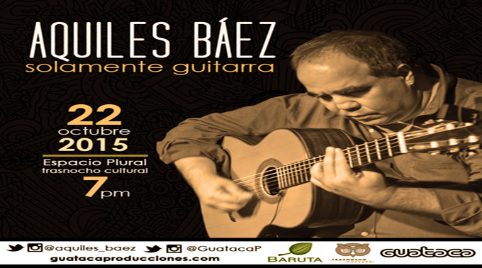 Desde el infinito territorio que representa para él la guitarra, esta será la oportunidad para disfrutar de Aquiles Báez, cara a cara, en la intimidad. Será una noche exclusiva para pasear por los clásicos de su repertorio así como para mostrarle al público presente nuevas composiciones y experimentos musicales. La cita para presenciar Aquiles Báez: Solamente guitarra será el próximo jueves 22 de octubre a las 7:00pm en el Espacio Plural del Trasnocho Cultural. Las entradas se encuentran ya disponibles en las taquillas del Trasnocho Cultural.l Más información en las redes sociales de Aquiles Báez @Aquiles_Baez y en @GuatacaP en Instagram y Twitter, “Guataca Producciones” en Facebook.
