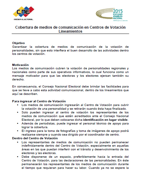 El Consejo Nacional Electoral publicó un comunicado en el cual establece los lineamientos que deberán seguir los medios de comunicación y sus periodistas en la cobertura del proceso electoral que se celebrará el 6 de diciembre.
