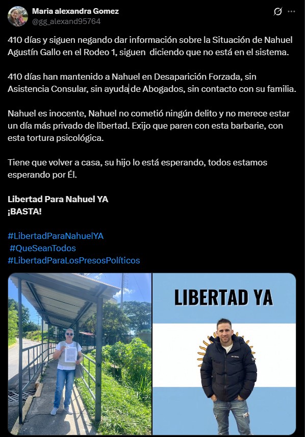 A través de su cuenta de X, María Alexandra Gómez denunció que, a pesar de que ha pasado más de un año desde la detención de Gallo, las autoridades venezolanas siguen negándose a proporcionar datos sobre su paradero o estado jurídico y continúan afirmando que “no está en el sistema”.