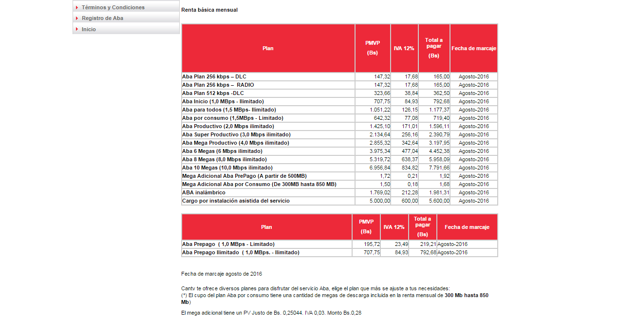 En la lista tambien aparecen el plan Mega Productivo 4,0 Mbps ilimitado en Bs. 3.197,97 y el plan ABA de 10 Megas ilimitado a un costo de 7.791,66 bolívares.