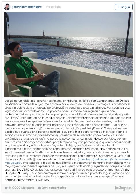 El reconocido actor Jonathan Montenegro informó que el tribunal de Juicio con Competencia en Delitos de Violencia Contra la mujer, «me absolvió por el delito de Violencia Psicológica, acordando el cese inmediato de las medidas de protección y seguridad dictadas al inicio».