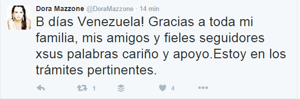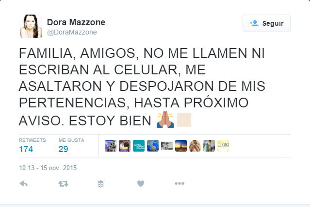 Indicó que a pesar del hurto se encuentra bien. “Familia, amigos, no me llamen ni escriban al celular. Me asaltaron y despojaron de mis pertenencias. Estoy bien”, publicó en su red social @DoraMazzone en Twitter.