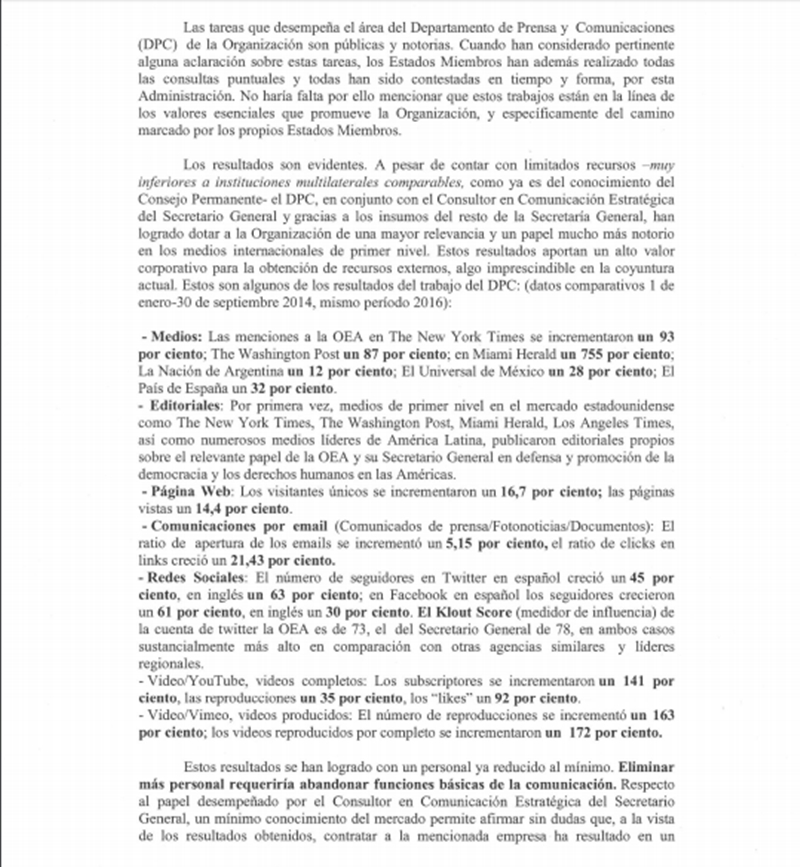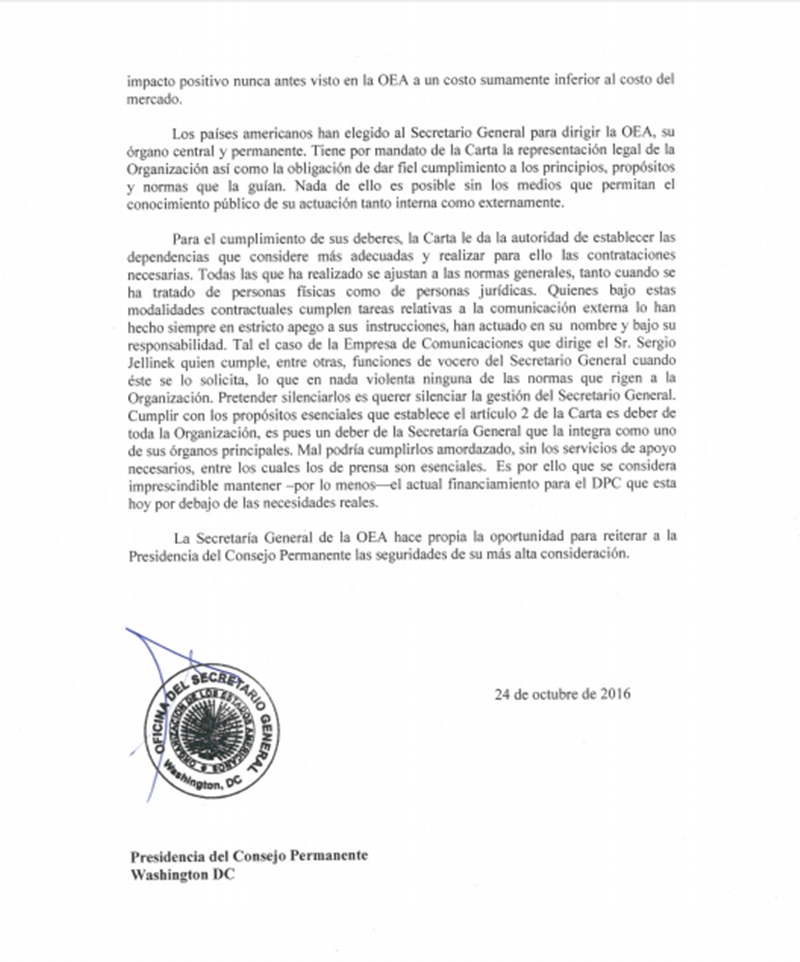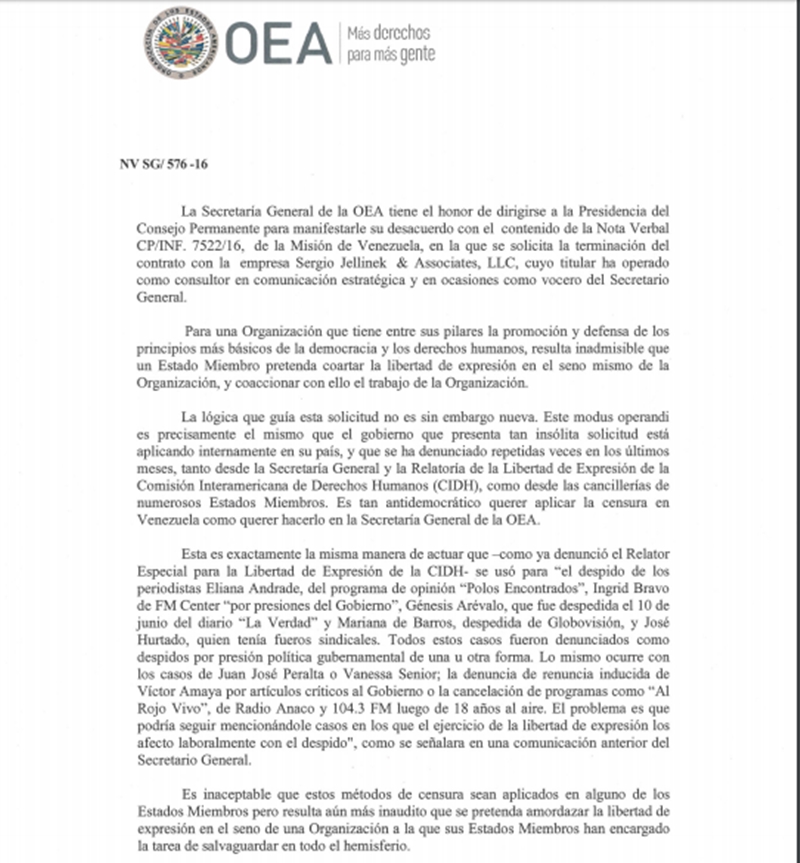 El Secretario General de la OEA, Luis Almagro, respondió a la petición del gobierno de Venezuela para que el organismo regional cese el contrato de trabajo con la empresa Sergio Jellinek and Associates LL.C, la cual presta servicios de consultoría en comunicaciones estratégicas y “en ocasiones” de vocería de la Secretaría General.