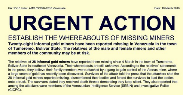 Amnistía Internacional, como mediador de los derechos humanos en Venezuela, indicó que los familiares de los mineros y otros miembros de la comunidad pueden correr peligro.