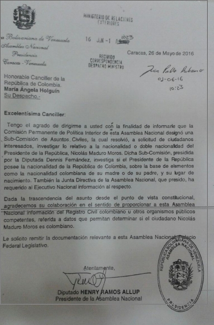 El presidente de la Asamblea Nacional, Henry Ramos Allup, envió a la canciller de Colombia, María Ángela Holguín; al presidente del Congreso de ese país, Luis Fernando Velasco y a la Registraduría Nacional del Estado Civil de Colombia, sendas comunicaciones en las que solicita el apoyo para «investigar lo relativo a la nacionalidad o doble nacionalidad» del presidente de la República de Venezuela, Nicolás Maduro Moros.