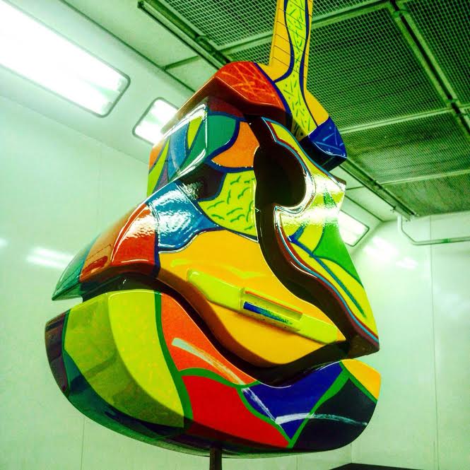 La obra “Lips” está llena de color para representar la esencia de los niños que son esperanza y futuro. “En su honor hay colores vivos, alegres en donde predominan amarillo, mostaza, azul, verde y los toques rojos, naranjas y magenta que se fusionan para dar vida”, explica el artista. Fue realizada en madera sólida respetando algunas partes del instrumento en desuso como el diapasón, el clavijero, las clavijas, los trastes y algunas cuerdas.