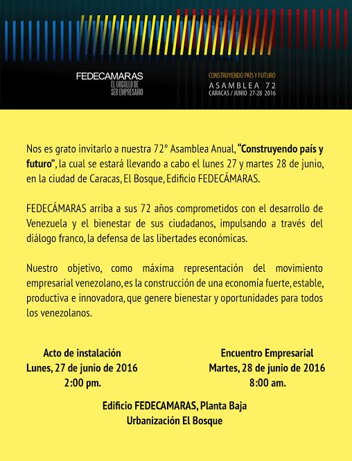 Caracas, 20 de junio 2016.- El lunes 27 y martes 28 de junio de 2016, las principales cámaras del sector empresarial, sectores productivos, empresarios, se darán cita en Caracas para celebrar la 72° Asamblea Anual de Fedecámaras,