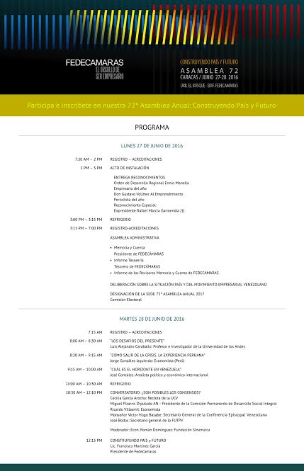 El martes 28 de junio, a las 8 am, se llevará a cabo el Encuentro Empresarial con destacados panelistas: Luis Alejandro Caraballo, profesor e investigador de la Universidad de los Andes; Jorge González Izquierdo, economista peruano, quien nos trae la experiencia de su país y cómo lograron salir de la crisis. José Gonzáles, analista político y económico internacional. Se realizará también un conversatorio sobre la necesidad de lograr consensos en nuestro país y contará con la participación de Cecilia García Arocha, rectora de la UCV; Miguel Pizarro, Diputado de la AN; el economista Ricardo Villasmil; Secretario General de la Conferencia Episcopal Venezolana, Monseñor Víctor Hugo Basabe; y el líder sindical, José Bodas. La 72° Asamblea Anual cierra con la participación de Francisco Martínez, presidente de Fedecámaras y su ponencia: “Construyendo país y futuro”.