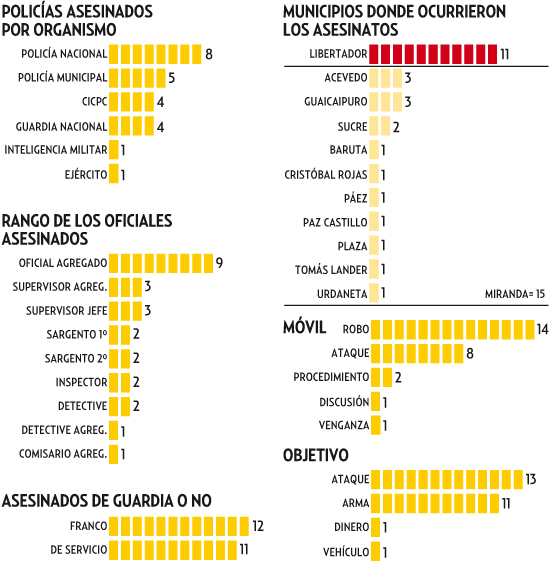 Un análisis detallado de las estadísticas muestran que el organismo con mayor número de bajas en lo que va de año es la Policía Nacional Bolivariana, con 8 funcionarios muertos, 28,5% del total, seguido por las policías municipales que acumulan cinco asesinatos entre igual número de cuerpos policiales, las víctimas eran de Policaracas, Polichacao, Polisucre, Polindependencia y Polibaruta.