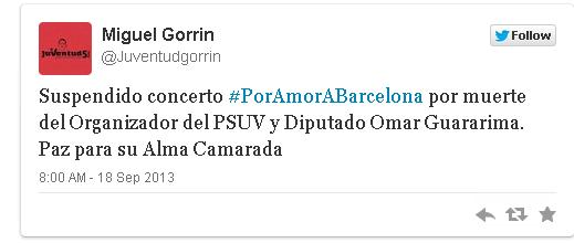– El coordinador de Deporte y Recreación de la juventud del Psuv en Anzoátegui, Miguel Gorrín, informó a través de su cuenta en Twitter que fue suspendido el concierto «Por Amor a Barcelona» por la muerte de Guararima.