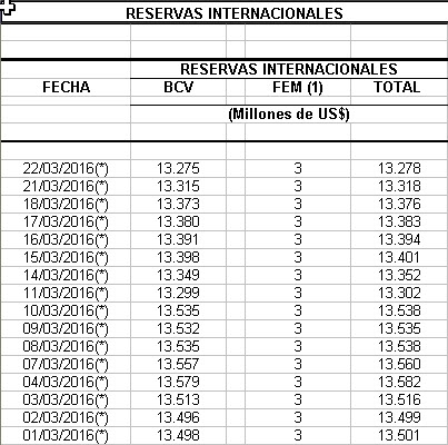Las reservas internacionales de Venezuela siguen en franco descenso. Datos del BCV indican que al 22 de marzo del año en curso la cifra se ubicó en 13.278 millones de dólares, lo que representa una caída de más de 3 mil millones de dólares si se compara con los 16.538 millones de dólares que alcanzaron al cierre de 2015.