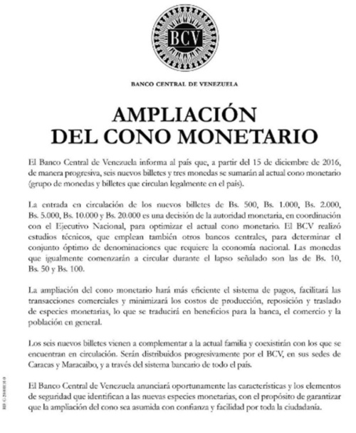 De acuerdo con el comunicado del ente emisor, “la entrada en circulación de los billetes de 500, 1.000, 2.000, 5.000, 10.000 y 20.000 es una decisión de la autoridad monetaria, en coordinación con el Ejecutivo nacional, para optimizar el actual cono monetario”.