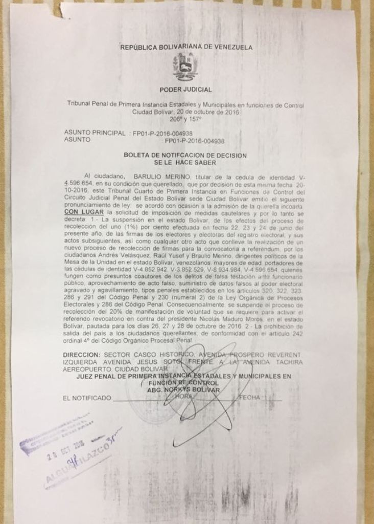 Así lo manifestó tras recibir la noche de este jueves una boleta de notificación del Tribunal Cuarto de Primera Instancia en funciones de Control del Circuito Judicial Penal del estado Bolívar, a cargo de la juez Norkys Bolívar, en la cual se le imponen medidas cautelares y se anula el proceso de recolección del 1% de las firmas llevado a cabo en junio a solicitud de la coalición opositora.