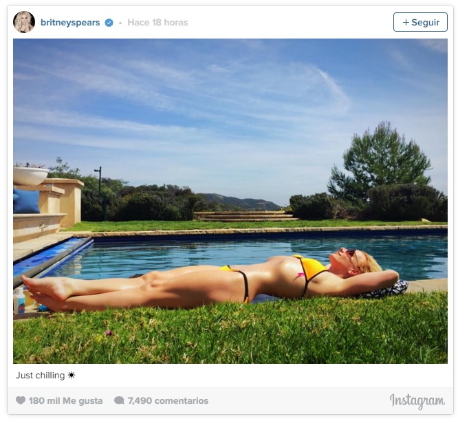 Como muestra, la imagen que la intérprete de “Baby One More Time” publicó el pasado domingo en sus redes sociales, y donde aparece acostada al lado de una alberca.