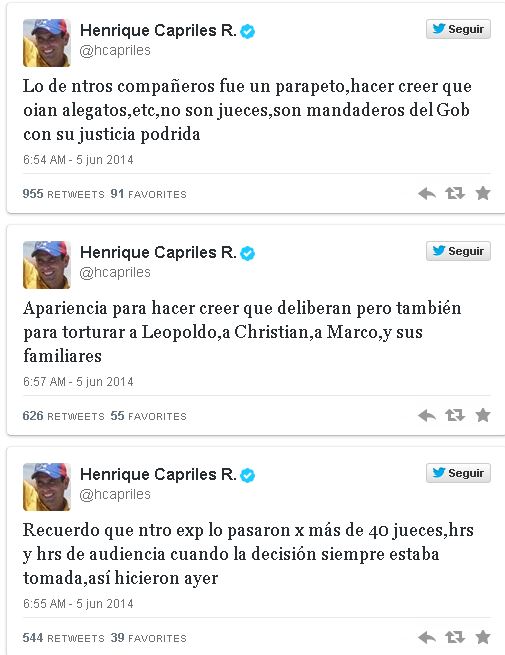 Indicó que los tres días de audiencia en los que la jueza Adriana López escuchó todos los argumentos de los abogados de la defensa por horas no fue más que «un parapeto». «(Es) apariencia para hacer creer que deliberan pero también para torturar a Leopoldo (Lòpez), a Christian, a Marco, y sus familiares», puntualizó Capriles.