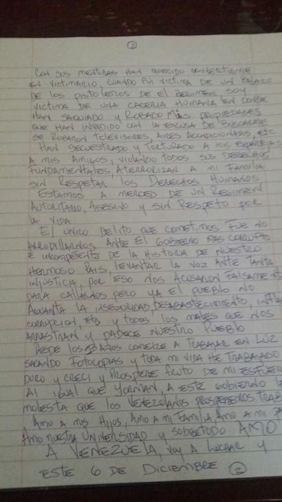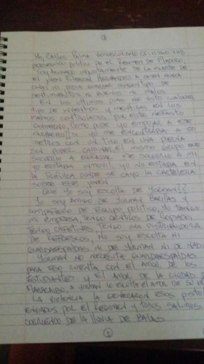 “Soy acusado injustamente de la muerte de un joven al cual nunca conocí”, Así inició la misiva de tres páginas el joven estudiante quien aclaró que no es guardaespaldas de Yorman Barillas, presidente de la Federación de Centros Universitarios (FCU) de LUZ del que tampoco se sabe de su paradero.