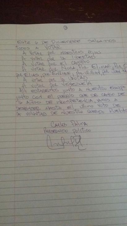 Carlos palma, militante del movimiento Unidad6 del la Universidad del Zulia (LUZ) hizo pública una carta donde se autodenomina perseguido político “por el régimen de (Nicolás) Maduro”, 13 días después de la muerte del estudiante Eleazar Hernández, en las inmediaciones de LUZ el pasado 30 de octubre.