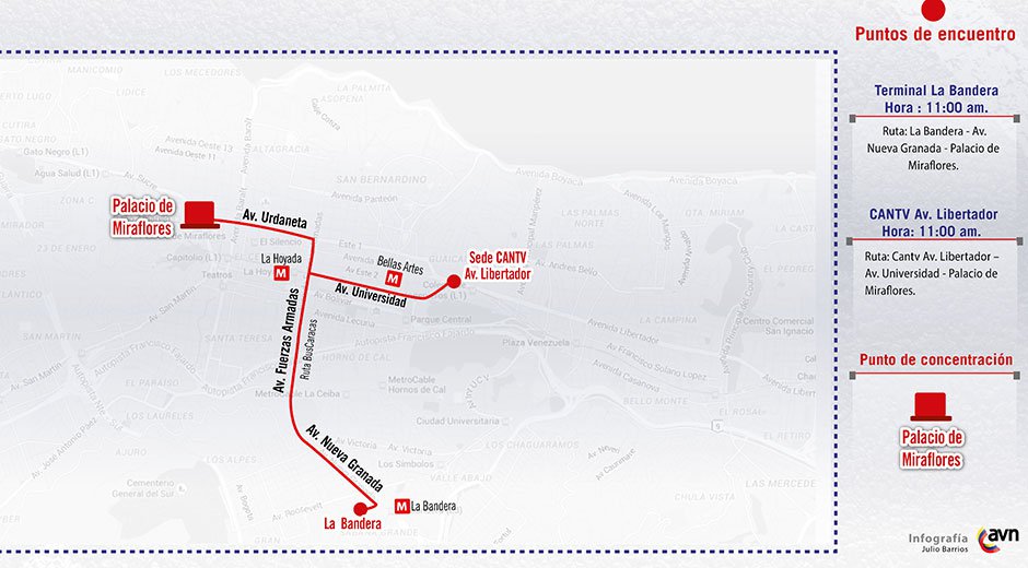 Las personas que se concentren desde La Bandera pasarán por la avenida Nueva Granada hasta la avenida Urdaneta; mientras que los que se reúnan en la Cantv recorrerán la avenida Universidad rumbo al Palacio de Miraflores.