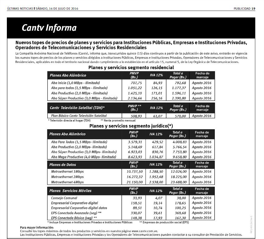 Este fin de semana , la Compañía Anónima Nacional Teléfonos de Venezuela (CANTV), dio a conocer a través de su página web las nuevas tarifas de sus planes y servicios de internet, los cuales estarán vigentes a partir del primero de Agosto de este año.