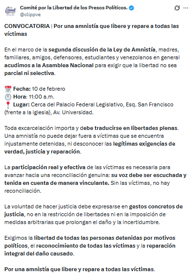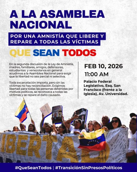 El Comité por la Libertad de los Presos Políticos hizo un llamado a la ciudadanía a concentrarse este martes 10 de febrero a las 11:00 a.m. en las inmediaciones del Palacio Federal Legislativo. La movilización coincidirá con la segunda y definitiva discusión de la Ley de Amnistía en la Asamblea Nacional.