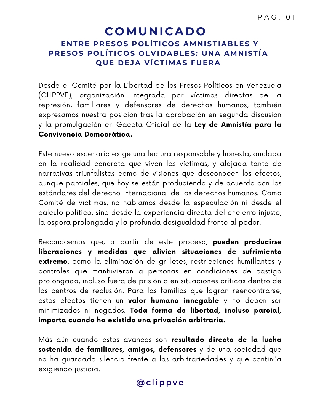 La ONG Comité por la Libertad de los Presos Políticos (Clippve) exigió este sábado este sábado 21 de febrero, que los beneficios de la Ley de Amnistía en Venezuela se extiendan a todos los presos políticos «sin discriminación ni exclusión».