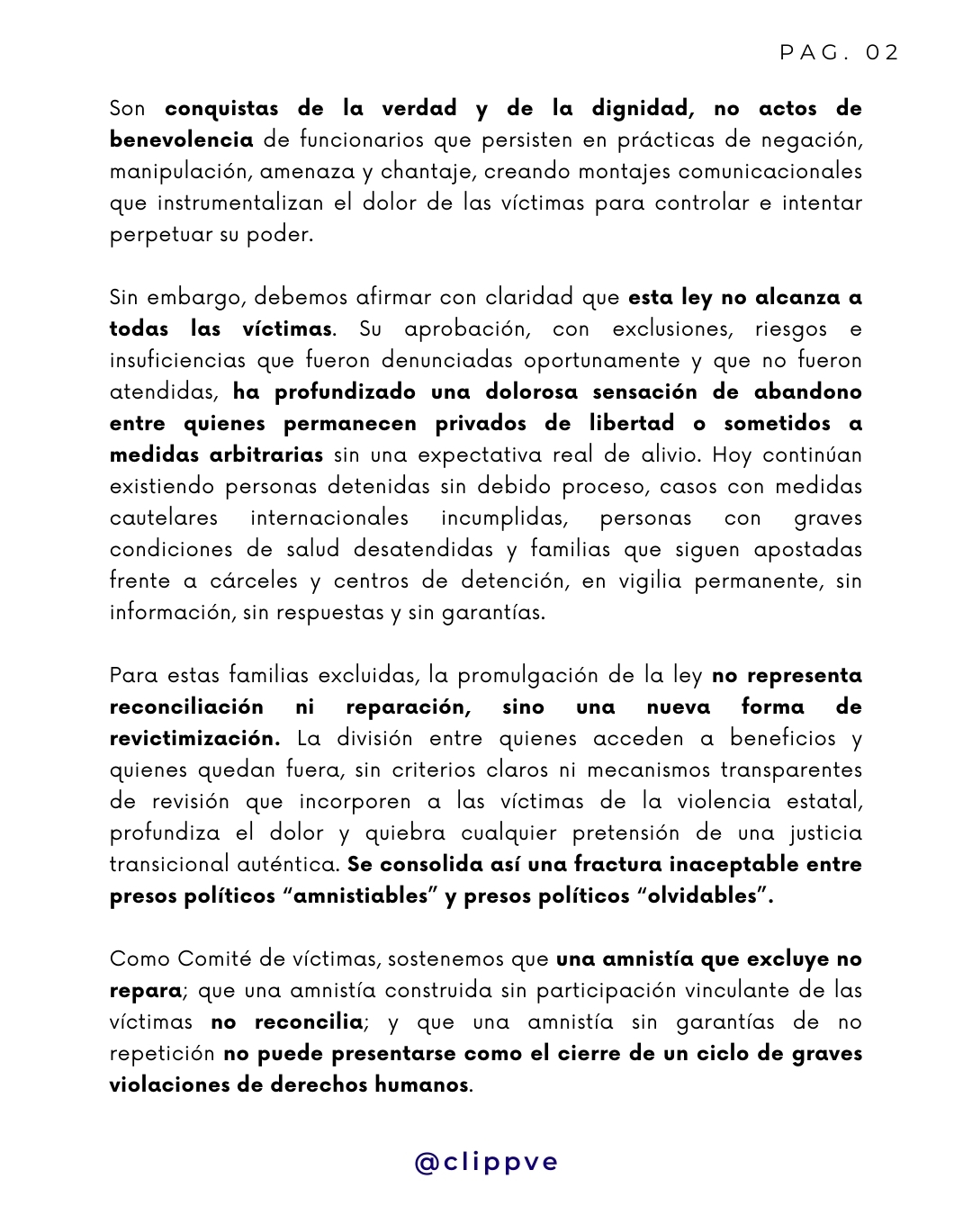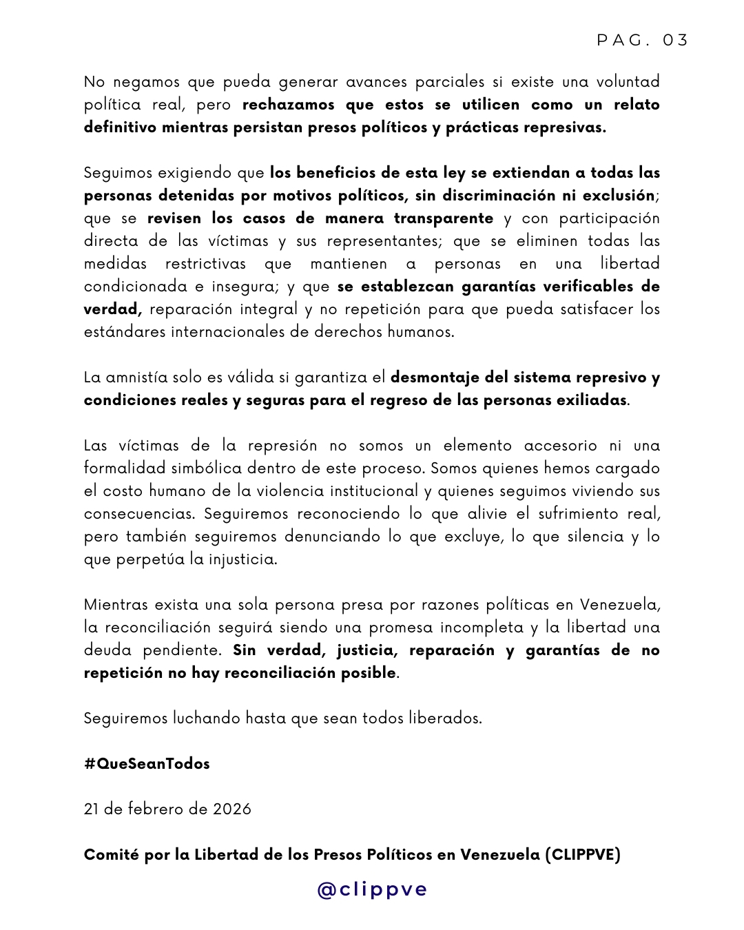 «Seguimos exigiendo que los beneficios de esta ley se extiendan a todas las personas detenidas por motivos políticos, sin discriminación ni exclusión», manifestó la organización en un comunicado publicado en X.