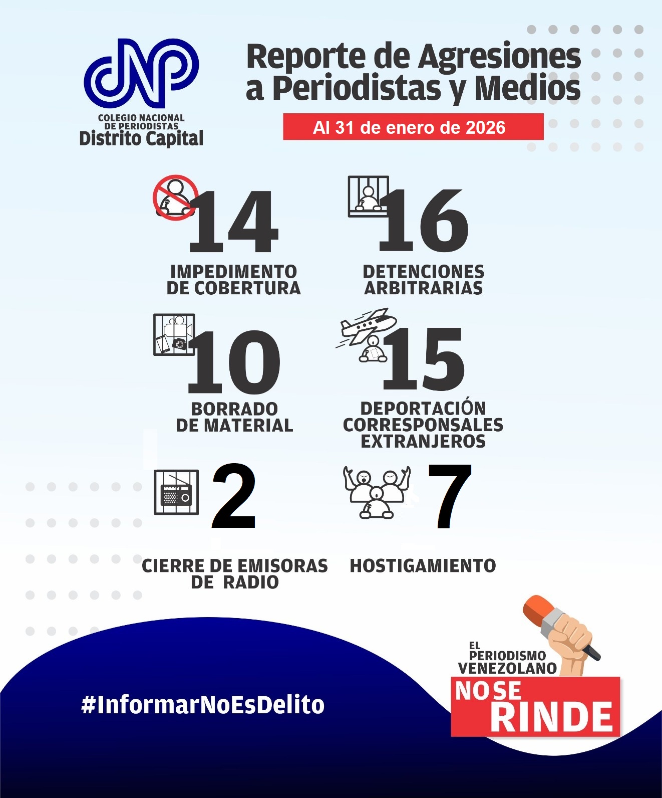 El CNP Caracas exige la libertad plena y sin condiciones para los colegas Rory Branker, Marifel Guzmán, Juan Pablo Guanipa, Deivis Correa, Pedro Uribarri y Jonathan Carrillo, detenidos en el ejercicio de su labor.