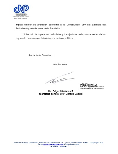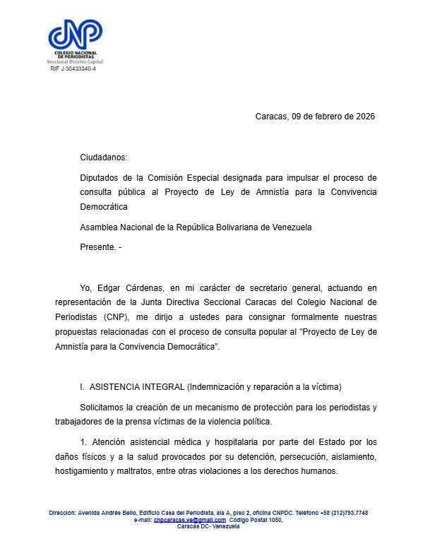 La seccional Caracas del Colegio Nacional de Periodistas (CNP) consignó ante la Asamblea Nacional una serie de propuestas técnicas para fortalecer el proyecto de Ley de Amnistía. El gremio solicita que la normativa no solo se limite a la liberación de los comunicadores, sino que contemple una reparación integral y la indemnización por los daños derivados de la persecución política contra la prensa.