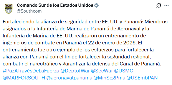 El Comando Sur de Estados Unidos informó a través de su cuenta en X que efectivos del Cuerpo de Marines de ese país llevaron a cabo un entrenamiento conjunto con la Infantería de Marina del Servicio Nacional Aeronaval (Senan) de Panamá.