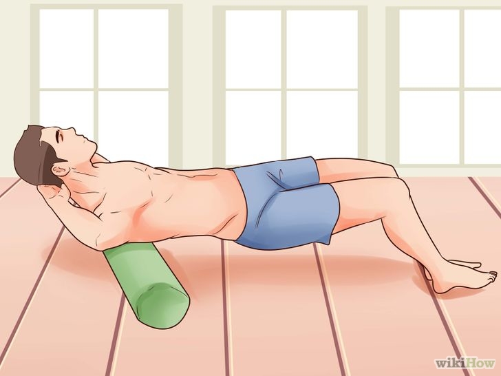 Recuéstate en una superficie plana con el rodillo colocado de forma perpendicular a tu espalda. Coloca el rodillo justo debajo de tus omóplatos. Levanta tus caderas a unos centímetros (pulgadas) del suelo. Mantén tu cabeza y tus hombros lejos del suelo. Usa tus pies para rodar por unos minutos hacia adelante y hacia atrás sobre el rodillo.