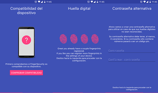 En una de las pantallas del menú de configuración, podrás comprobar la compatibilidad. Acto seguido, FingerSecurity se pedirá que establezcas una contraseña de cuatro caracteres. Esto es necesario por si no puedes usar tu huella dactilar para desbloquear aplicaciones como WhatsApp.