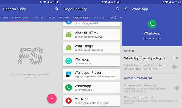 Una vez hayas terminado de configurar inicialmente FingerSecurity, sólo resta elegir quéaplicaciones quieres proteger con tu huella dactilar. Prácticamente todas son compatibles con esta aplicación de privacidad.