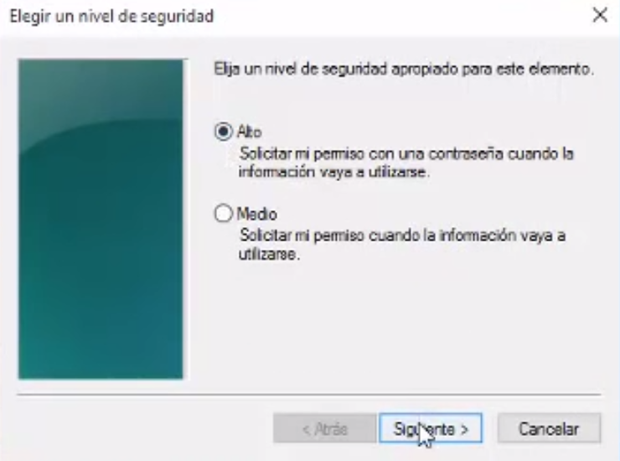 Antes, tienes que elegir si quieres un nivel de seguridad alto o medio. Lo recomendable es seleccionar el alto, por lo que pueda pasar, pero debes saber que de hacerlo, cada vez que vayas a utilizar la información se te pedirá que introduzcas la contraseña.