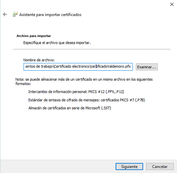 El asistente de instalación se solicitará que le indiques cuál es el certificado que quieres importar a tu sistema, Windows en este caso. Tienes que hacer click sobre Examinar y buscar en tu sistema de archivos el fichero del certificado digital.